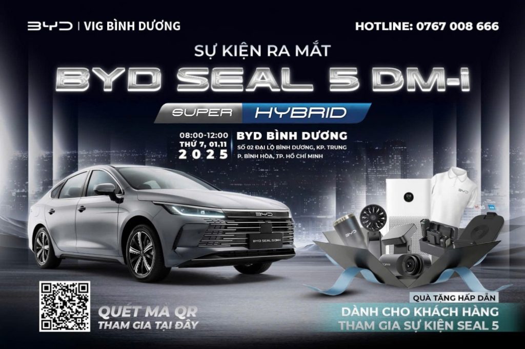 Tiếp nối thành công đó, vào lúc 08h – 12h ngày 01/11/2025 tới đây, tại đại lý BYD Bình Dương – showroom chính hãng có quy mô lớn nhất của BYD tại TP. Hồ Chí Minh sẽ tổ chức buổi “Lễ Ra Mắt BYD SEAL 5 DM-i”.